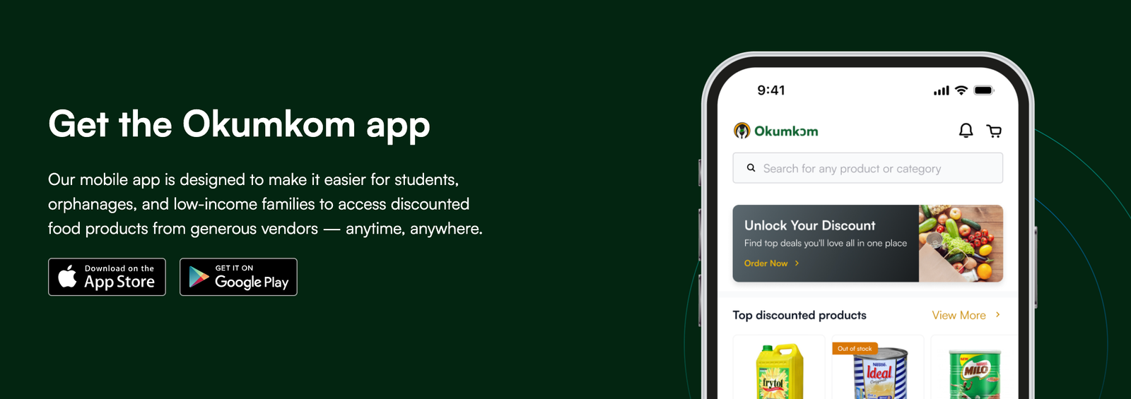 The Okumkom Discount Food App is a digital marketplace that bridges the gap between food waste and hunger. It connects individuals, food vendors, and NGOs to surplus and discounted food in real-time ensuring every meal counts. Through a mobile-first, cashless, and transparent platform, users can: Access discounted meals or donated food directly from restaurants, companies, and markets. Track deliveries and donations in real time. Support food banks and NGOs with efficient food sourcing.